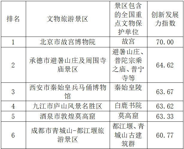 文物旅游景区创新发展力评估是对景区智慧旅游建设和品牌营销发展水平进行的综合评价据得分得到榜单前十。随着疫情防控工作进入常态化,各景区锚定数字化发展方向,积极创新发展思路,提升景区竞争力,激发市场活力,对于文物旅游景区未来发展起到关键作用。国家对于文物旅游景区的保护利用、价值挖掘与创新发展给予高度关注。2021年国务院办公厅印发《“十四五”文物保护和科技创新规划》,提出大力推进让文物活起来,坚持创造性转化、创新性发展,创新文物合理利用方式,妥善处理保护与开发的关系,推动文物保护单位、博物馆成为特色旅游目的地和文明旅游的典范。从景区创新发展力榜单排名来看,故宫博物院依然位列前茅,承德避暑山庄及周围寺庙景区、秦始皇兵马俑博物馆分列二、三位。