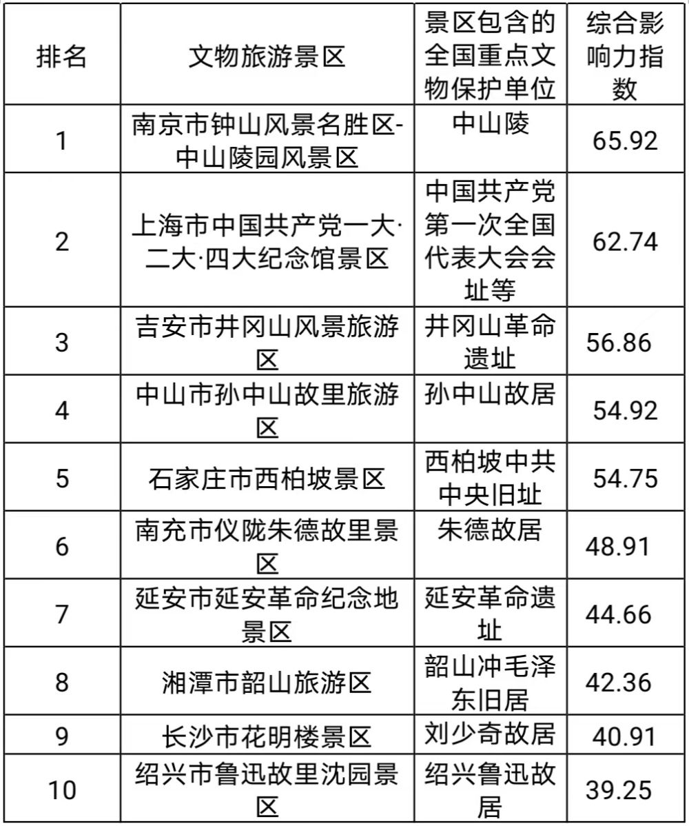 表2 全国文物旅游景区综合影响力TOP10